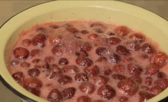 - Laat de bessen 2,5 uur (of een nacht) met suikers om sap te extraheren. Het sap moet alle suiker volledig verzadigen.