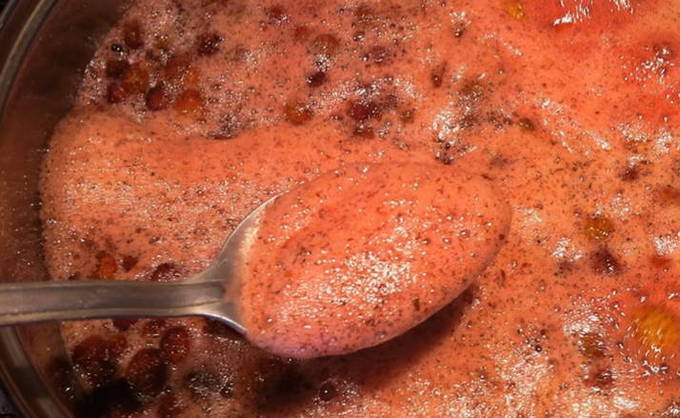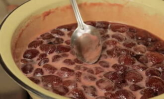 - Als de jam kookt, verwijder het schuim met een lepel en kook 5 minuten. Laat het daarna helemaal afkoelen en zet het weer op het vuur en kook. Kook de bessen nog 5 minuten.