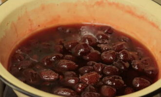 - Begin met koken. Zet de schaaltjes met bessen op laag vuur op het fornuis. Je kunt voorzichtig roeren. Als de suiker volledig is opgelost, breng je de bessen aan de kook.