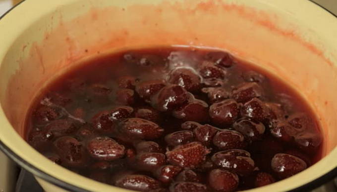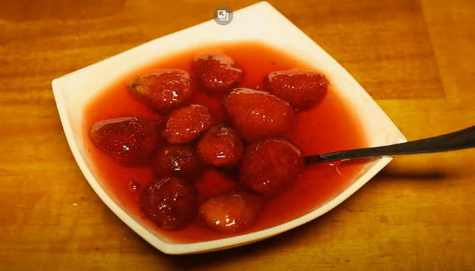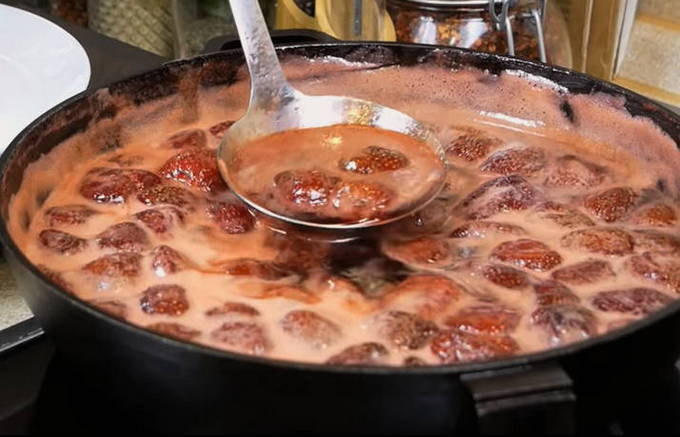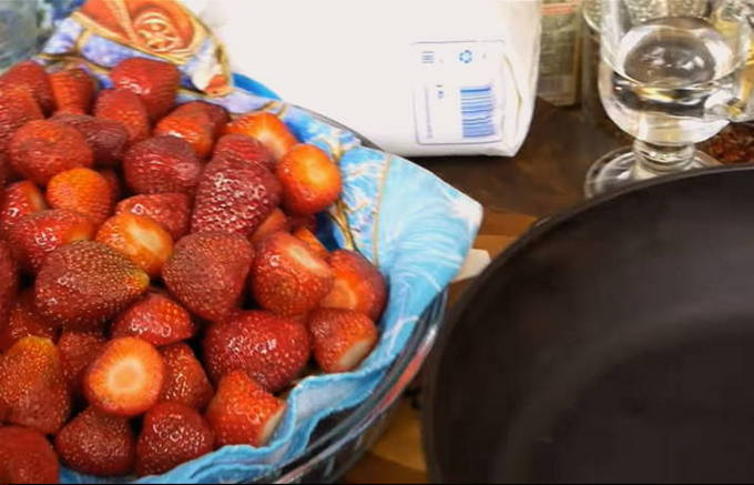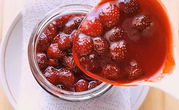 Het geheim van het maken van zo'n jam zit in hete siroop, die over verse aardbeien wordt gegoten. Het blijkt een ongewone jam met levende bessen. Zo behouden ze meer nuttige eigenschappen dan bij conventioneel koken.