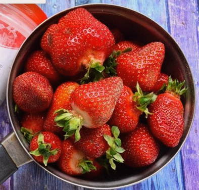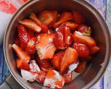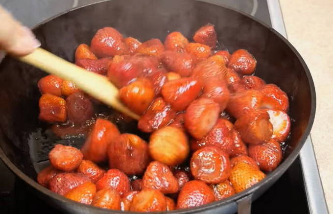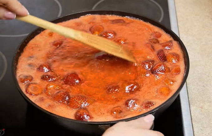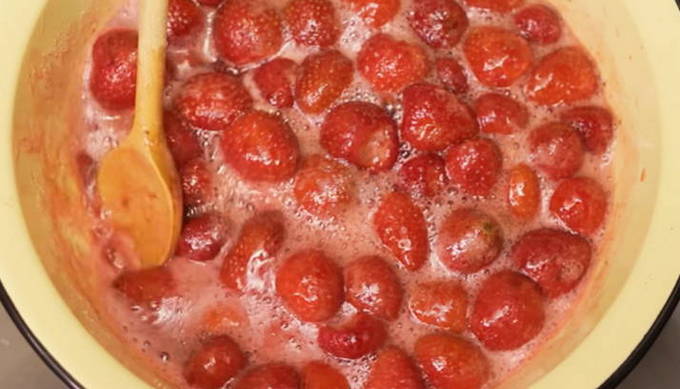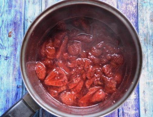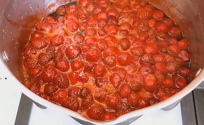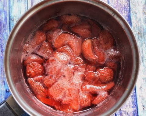 - Zet de schaal met aardbeien op het vuur en breng aan de kook. Laat vervolgens op laag vuur 5 minuten sudderen.