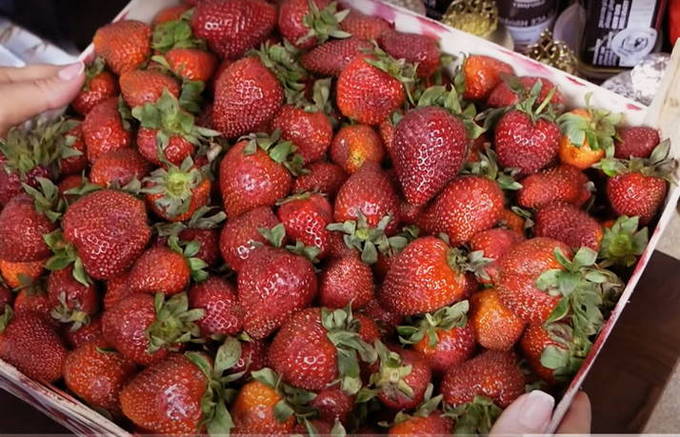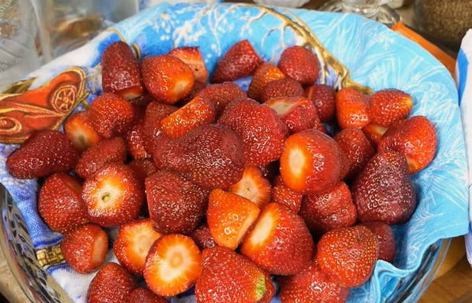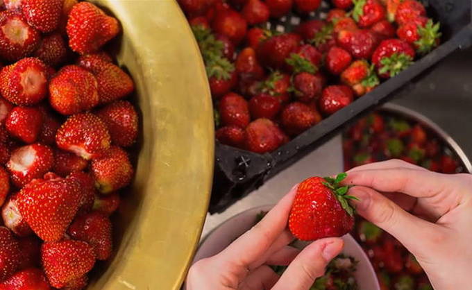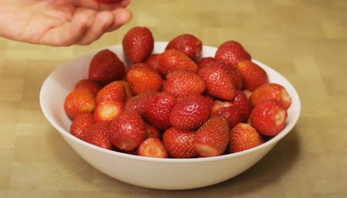 - Bereid je aardbeien voor. Spoel en droog de bessen, snijd alle staarten af. Indien gewenst kunnen de bessen worden gesneden.