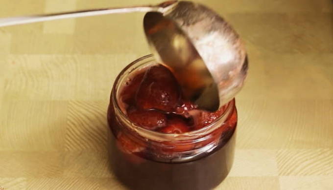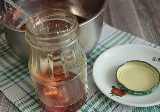 - Als de jam gaar is, kun je deze in de potten gieten. Vergeet niet de banken te steriliseren. Een geurige lekkernij is klaar! Een geweldige aanvulling op het ontbijt: op pannenkoeken, pannenkoeken of kaastaarten. Eet smakelijk!