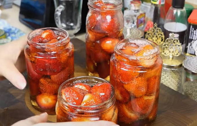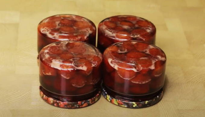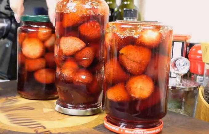 - De laatste fase: giet de bereide siroop op aardbeien in potten tot de rand. Draai de deksels stevig vast en draai de blikken ondersteboven. Laat ze in deze positie afkoelen. Na volledig afgekoeld te zijn, is de jam klaar. Het blijkt 1,5 liter aromatische jam te zijn.