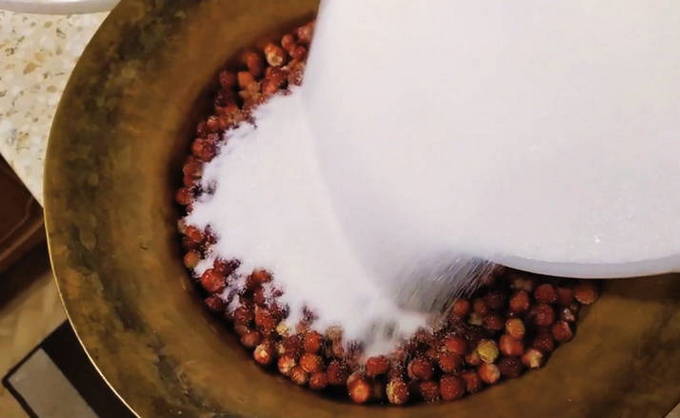 - Giet de bessen in de kom waarin je ze gaat koken en voeg alle suiker eraan toe.