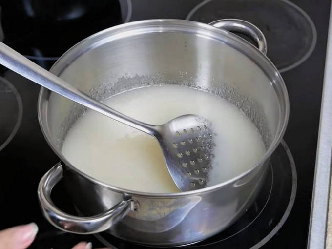 - Ga dan verder met de siroop. Neem een pan met een dikke bodem. Giet alle suiker in een pan en giet 200 ml water. Voeg 2 gram toe. citroenzuur. Roer tot de suiker het water volledig heeft opgenomen. Zet de kachel op gemiddelde temperatuur. Roer om de 2-3 minuten.
