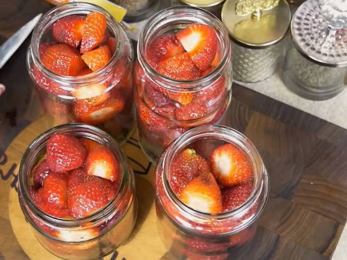 - Terwijl de siroop kookt, plaats je de voorbereide aardbeien in gesteriliseerde potten. Banken kunnen 7-10 minuten in de magnetron worden gesteriliseerd, na toevoeging van een beetje water aan elk. Het is beter om de deksels 4 minuten te koken. Als de aardbeien niet passen, mogen de bovenste bessen worden gesneden, maar druk ze niet naar beneden om ze op te vangen.