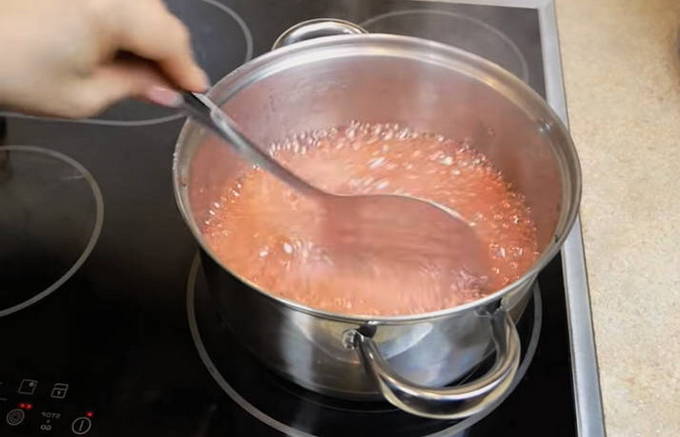 - Plaats vervolgens de bessen op het fornuis op middelhoog vuur. De suiker moet volledig zijn opgelost. Breng vervolgens de jam aan de kook en laat 5 minuten sudderen. Voeg tot slot de voorbereide gelatine toe. Het is belangrijk om te onthouden dat gelatine niet kan worden gekookt, anders verliest het zijn gelerende eigenschappen. Roer daarom na het toevoegen de jam goed door en haal hem van het vuur.