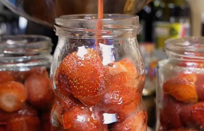 - Giet de hete siroop in potten aardbeien. Giet in een dunne stroom. Tegelijkertijd moeten potten en aardbeien warm of op kamertemperatuur zijn. Laat 15-20 minuten staan.