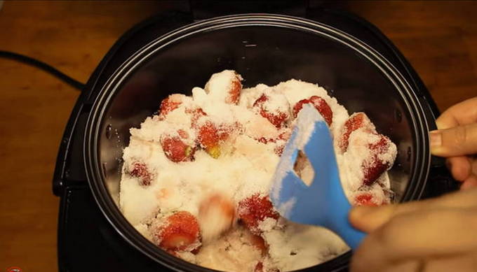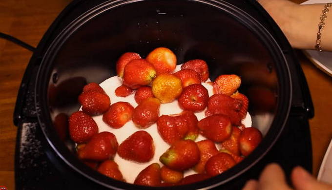 - Begin met het schuiven van de aardbeien en suiker in de kom van de multikoker. Het is handig om dit in lagen te doen: een laag aardbeien - een laag suiker, enzovoort. Zorg ervoor dat de aardbeien niet meer dan ¼ van het volume van de multicookerkom innemen. Laat het een uurtje staan om het aardbeiensap te laten trekken. Om het proces te versnellen, kun je direct 80 gram toevoegen. water en roer, dan hoef je niet te wachten tot de aardbeien sap afgeven.
