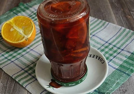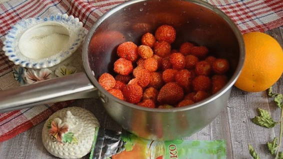 Dit recept is voor fans van ongewone smaken. U kunt uw favoriete jam diversifiëren door een sinaasappel toe te voegen. De lichte citrusnoot past goed bij het aardbeienaroma. Voeg nog een paar muntblaadjes toe om de traktatie nog interessanter te maken.
