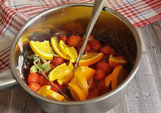 - Voeg de gesneden sinaasappel toe aan de gekookte aardbeien. Je kunt er ook een munttakje gooien als je dat wilt. Als er geen verse munt is, dan is droog ook geschikt. Breng de sinaasappeljam weer aan de kook. Kook vervolgens 10-12 minuten. Roer voorzichtig en verwijder het resulterende schuim.