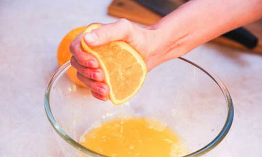 - Was de sinaasappels grondig, verbrand ze met kokend water en droog ze af. Snijd de schil eraf en pers het sap eruit.