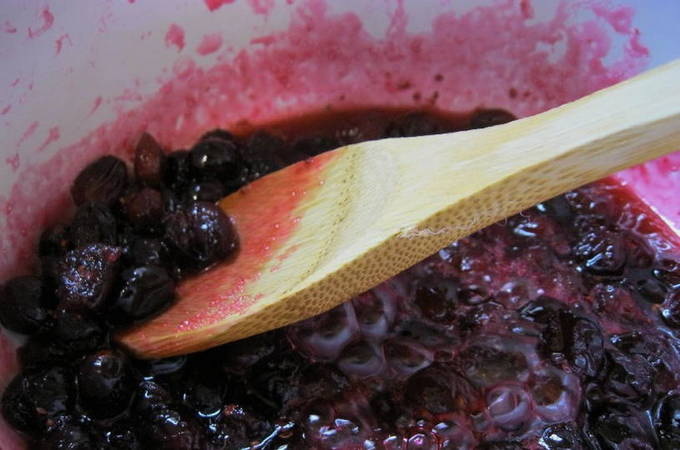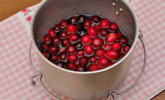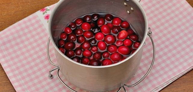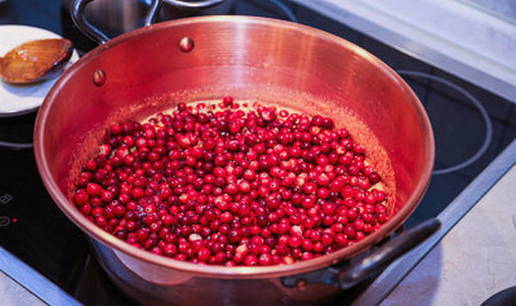 - Zet een pot veenbessen op het vuur, breng aan de kook en laat de jam 50-60 minuten sudderen, af en toe roeren.