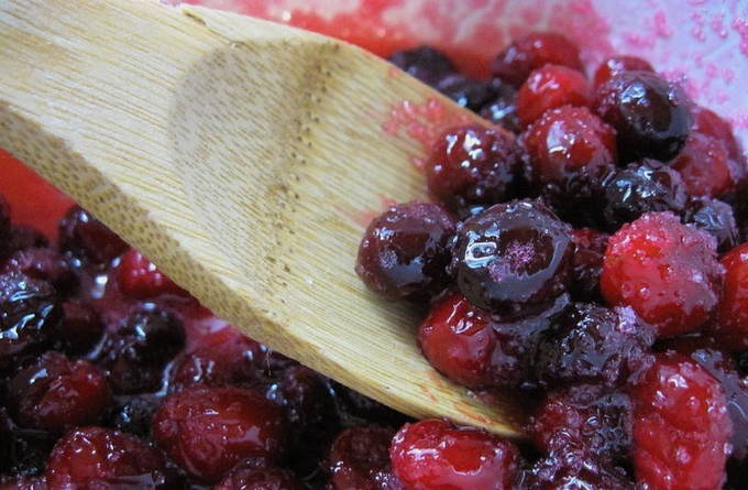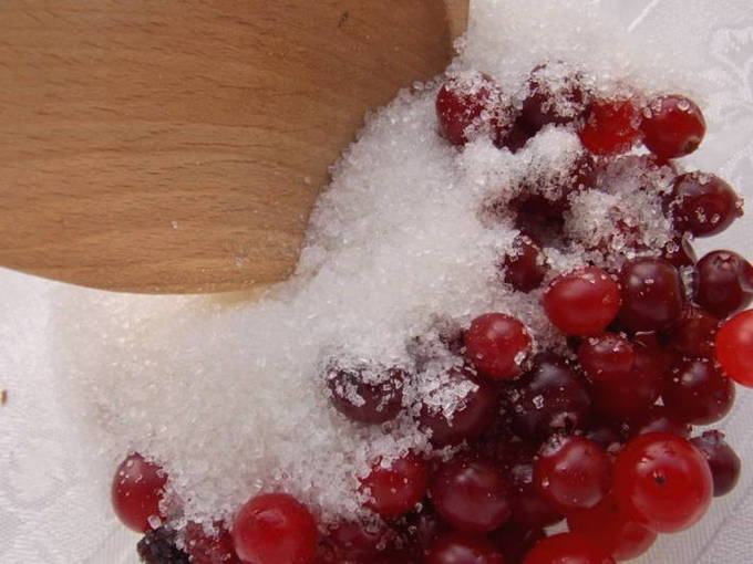 - Ontdooi de veenbessen volledig, bedek met suiker en laat een dag in de koelkast staan.
