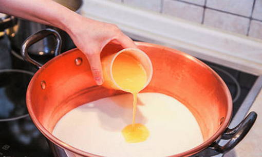 - Giet suiker in een pan en giet sinaasappelsap erbij. Breng de siroop aan de kook.