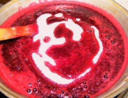 - Voeg vervolgens de bessenmassa toe aan de suikersiroop, meng en kook gedurende 15 minuten. Voeg vervolgens de resterende suiker toe.