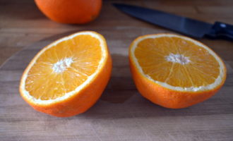 De sinaasappel moet ook grondig worden gewassen en vervolgens in 4 stukken worden gesneden. Verwijder eventuele pitjes. Let op: je hoeft de sinaasappels niet te schillen.