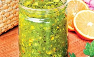 Kruisbessenjam met sinaasappel en citroen combineert perfect een scherpe smaak en een ongelooflijk aroma. Het bevat een enorme hoeveelheid vitamines, omdat het absoluut niet wordt onderworpen aan een warmtebehandeling en het bevat alleen verse bessen, fruit en kristalsuiker.