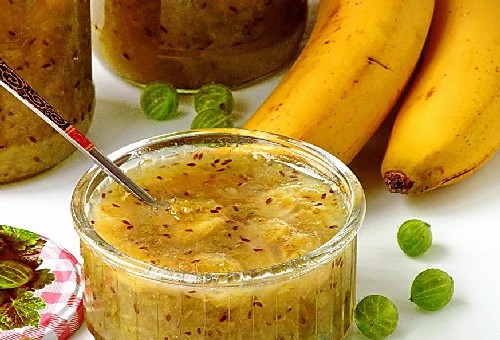 Je zult niemand verrassen met jam van kruisbessen en sinaasappel, maar probeer je gasten uit te nodigen om een versie van de bekende jam te proberen, maar dan met een tropisch tintje - met een banaan. De jam heeft een zeer interessante en heldere smaak die je doet denken aan warme zomerdagen.