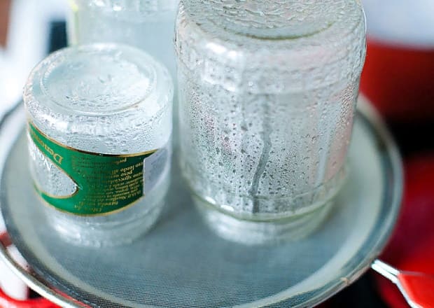- Terwijl de jam aan het brouwen is, heb je tijd om aan de potten te sleutelen. Neem het aantal blikken dat je nodig hebt en was ze eerst met zuiveringszout. In dit geval moet het water zo heet mogelijk zijn (voor zover uw handen dit kunnen verdragen). Daarna moet je de potten ongeveer 10-15 minuten koken (sommigen steriliseren de potten nog steeds in de oven of magnetron).