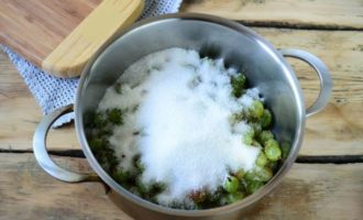 - Plaats de voorbereide bessen in een bak om jam te maken. Vul ze vervolgens met de benodigde hoeveelheid suiker en laat een nacht staan zodat de kruisbessen hun sap kunnen geven.