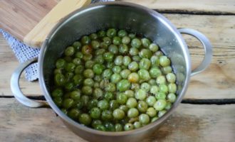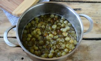- Plaats de voorbereide kruisbessen in een kom om jam te koken, giet er een beetje schoon water in en zet op een laag vuur. Kook de kruisbessen een paar minuten, tot de schil zacht is.