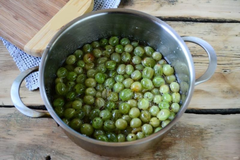- Bereid de kruisbessen voor op jam: snij de uiteinden af, spoel de bessen af, droog ze en prik op verschillende plaatsen met een tandenstoker.