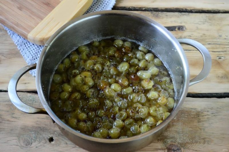 Zet 's morgens de gerechten met kruisbessen op een klein vuur en kook 5 minuten vanaf het begin van de kook. Zet het vuur uit en laat de jam 6-8 uur staan. We herhalen dit proces van vijf minuten koken met een pauze 3-5 keer, dat wil zeggen 's morgens en' s avonds.