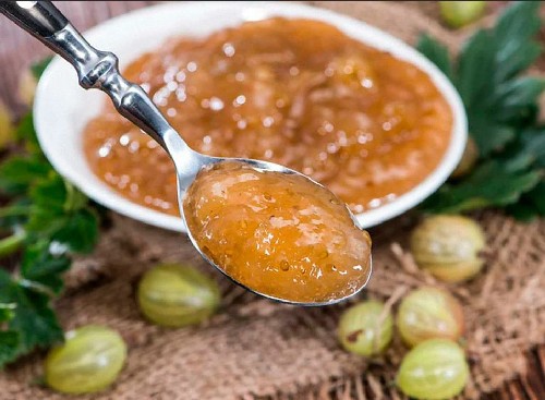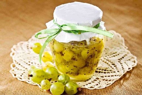 De op deze manier bereide kruisbessenjam wordt bepaald voor opslag op een donkere, koude plaats.