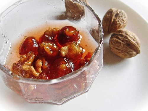 - Plaats bereide kruisbessen, partjes citrus en noten op hete siroop. Laat alles 8 uur staan, je kunt 's nachts, zodat de bessen en noten goed verzadigd zijn met siroop.