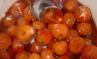 - Giet het fruit met heet water en kook gedurende 5 minuten, giet dan de vloeistof af en plaats het fruit in koud water.