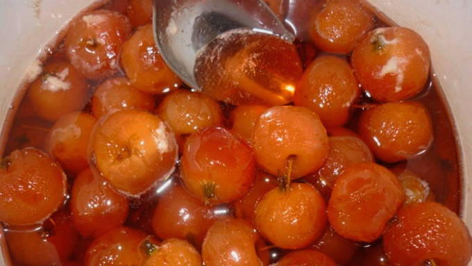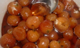 Doop de appels in de kokende zoete massa en haal de container onmiddellijk van het fornuis. Laat het fruit enkele uren onder druk staan om in de siroop te weken.