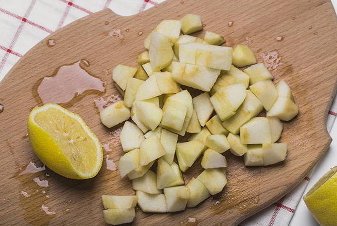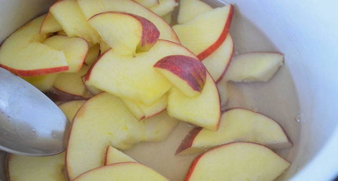 - Appels ontpitten, schillen en in schijfjes snijden.Knijp een beetje sap uit de citroen in een bak met water en doe de voorbereide stukjes fruit daarin. Kook de appelschijfjes 7 minuten, maar kook ze niet te lang: ze moeten intact blijven en mogen geen pap worden.