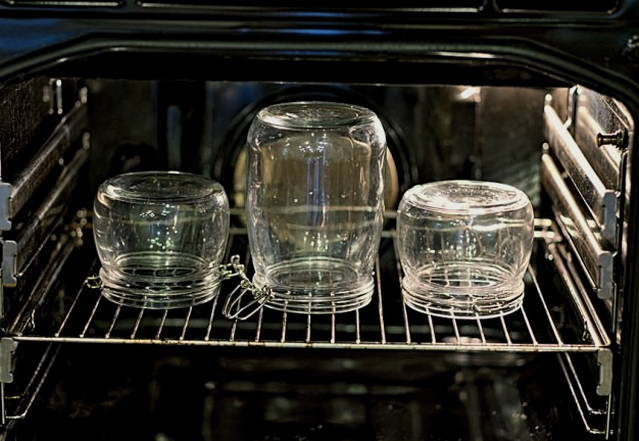 - Was en steriliseer potten voor het bewaren van blanco's door ze boven stoom of in de oven te houden.