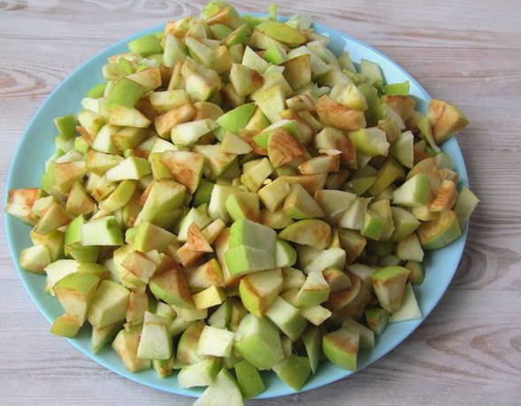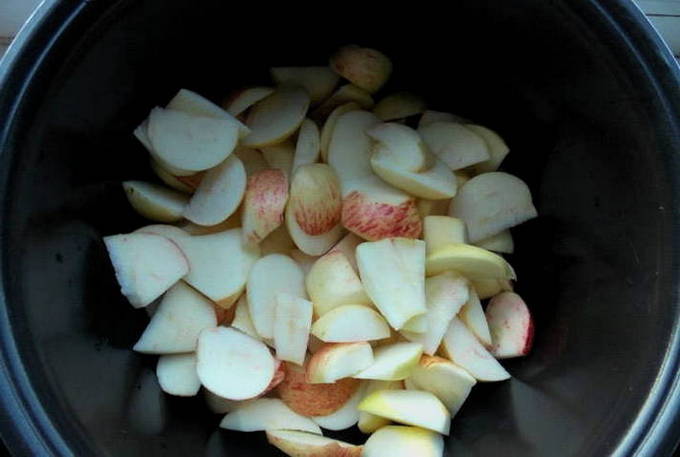- Was de appels, verwijder de staarten en zaden, snij in stukjes. Als de kooktijd beperkt is, kunt u de kern aan laten staan.