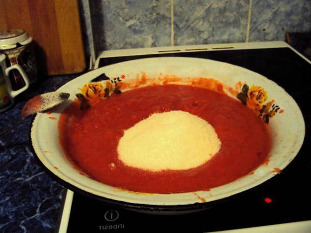 - Doe de appelpuree van de ranetki in een hittebestendige schaal, voeg suiker toe en kook op laag vuur tot de jam de gewenste dikte heeft. Hoe langer de massa kookt, hoe dikker de delicatesse wordt.