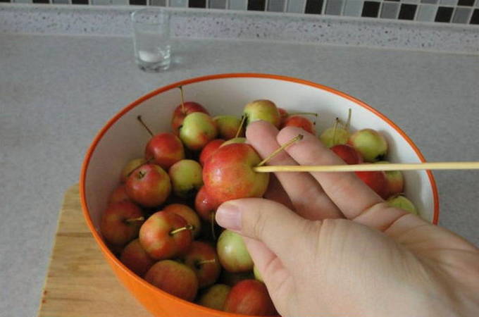 Sorteer de vruchten en was ze, scheur de staarten niet af, maar prik elke appel op verschillende plaatsen met een houten spies.