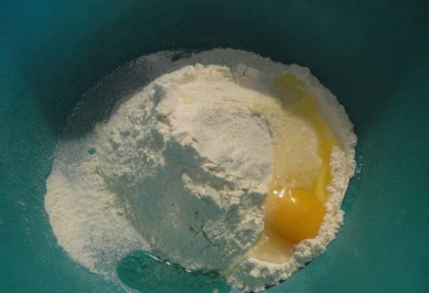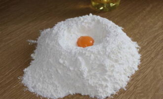 - Zeef de bloem en combineer met soda en zout. Breek een kippenei in dit droge mengsel.
