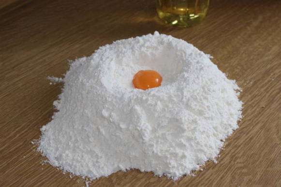 Zeef de bloem en strooi deze op een geschikt oppervlak. We maken een klein kuiltje in het product en dompelen er een kippenei in.