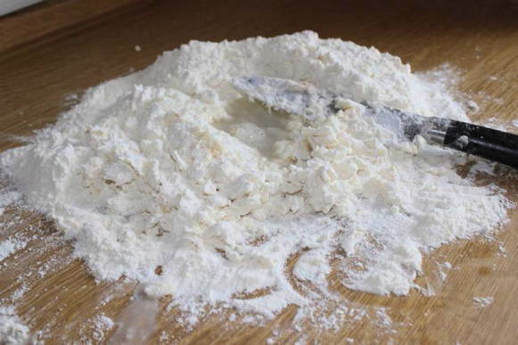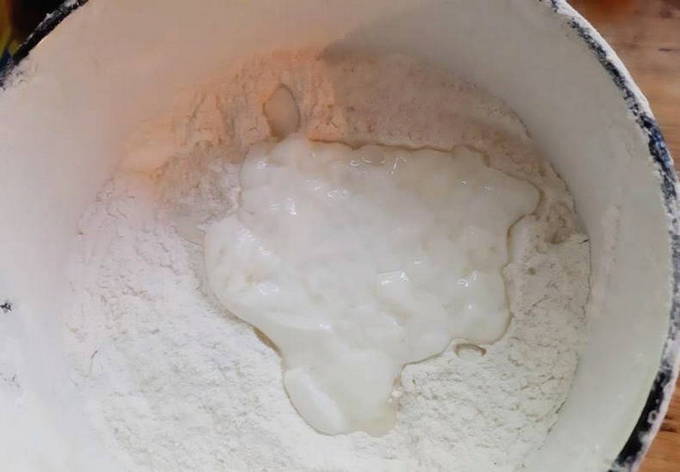 - Zeef de bloem en roer deze met zout en soda. Giet kefir in dezelfde massa.
