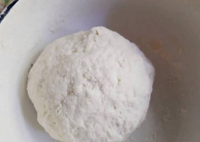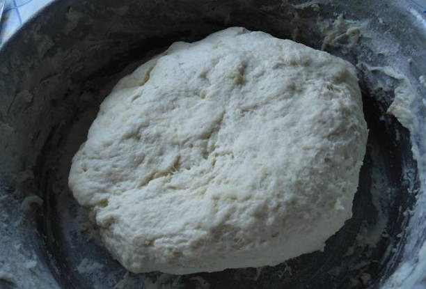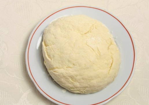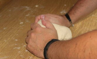 - We kneden een dicht en glad deeg van kefir, bloem, zout en soda. Om dit te doen, kneed je de producten voorzichtig met je handen.