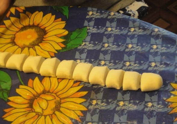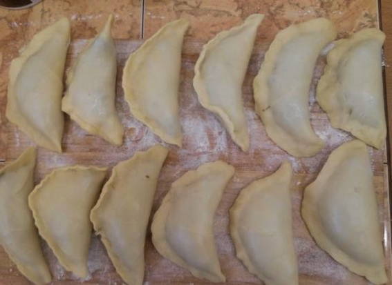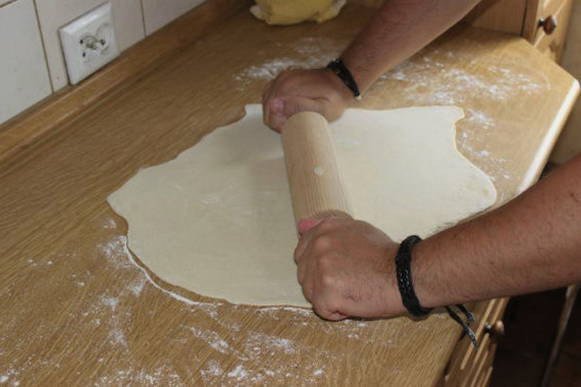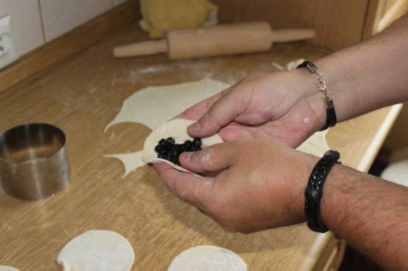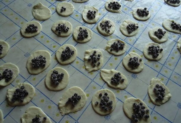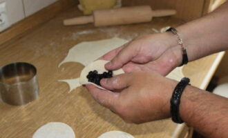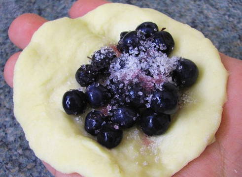 - Rol elk stuk dun tot een cirkel. Roer de bessen met suiker in het midden. Doe wat vullingen. We maken knoedels.