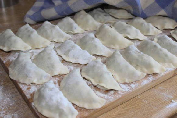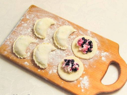 - We vullen elke cirkel met een massa kwark en bessen. We sluiten de blanco en vormen de dumplings.