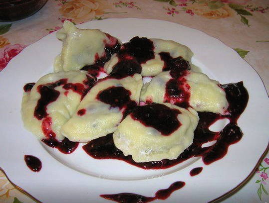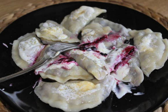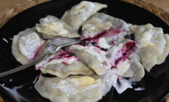 - Een warme traktatie met bessenvulling kan op een bord worden gelegd. Serveer de dumplings met zure room of jam.