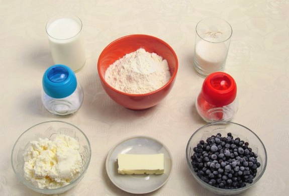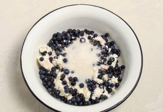 - Meng voor de vulling cottage cheese, suiker en gewassen bosbessen. Roer de massa.