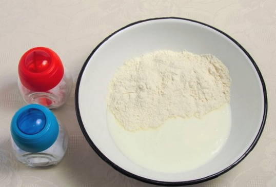 - Giet de kefir in een grote kom. Ook sturen we hier gezeefd meel, zout en soda naar toe.