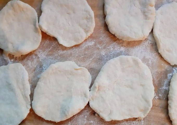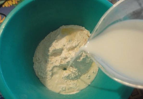 - Kneed een stevig deeg met je handen of met een broodmachine. Om dit te doen, moet u bloem, melk, zout en frisdrank in de aangegeven porties combineren.