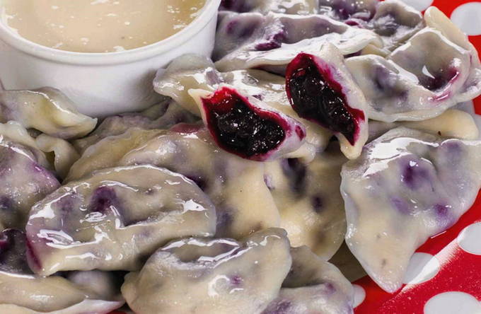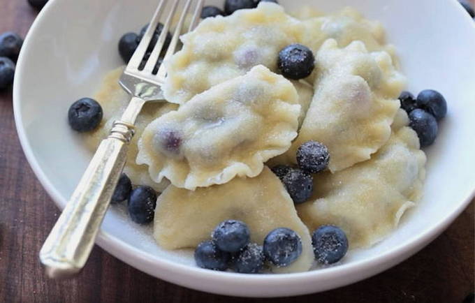 Een hartig idee voor op tafel - malse dumplings op melkdeeg met bosbessenvulling. Het lichtzoete gerecht kan worden geserveerd als dessert of bij een huisgemaakt ontbijt. Geschikt voor kindermenu's.