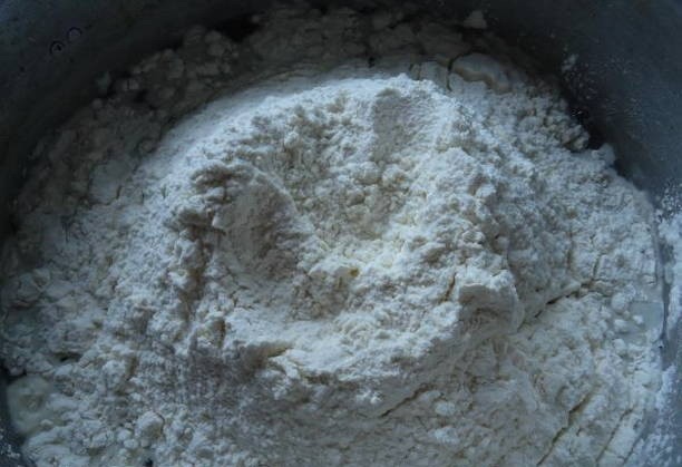 - Zeef de bloem met zout en soda in een diepe kom. Maak een kleine inkeping in het droge mengsel.